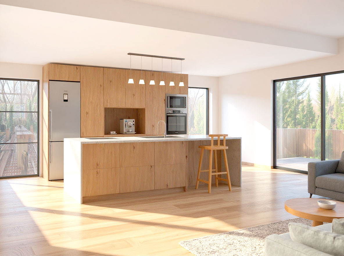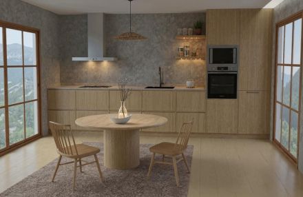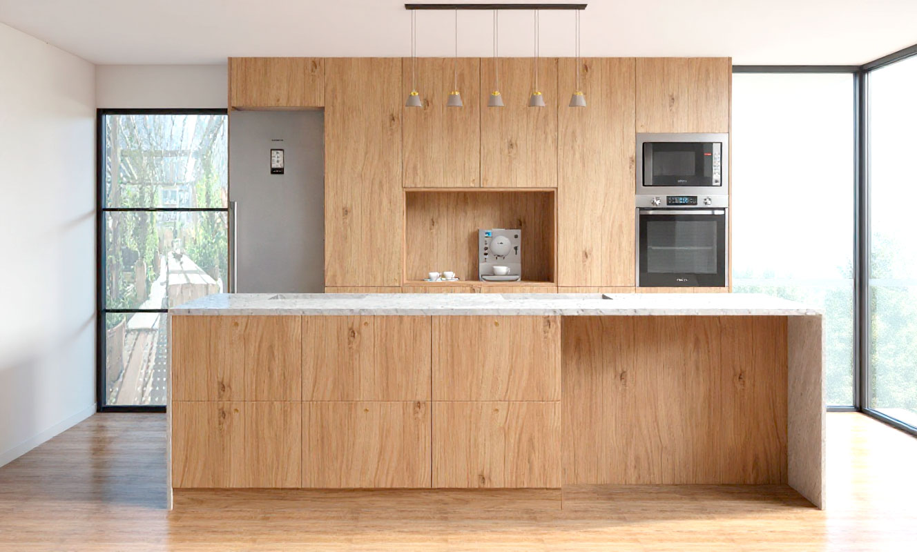La distribución en línea encaja perfectamente con la filosofía Japandi, donde menos es más. Con un mobiliario de líneas rectas, frentes sin excesos decorativos y una paleta de tonos neutros, este tipo de cocina logra transmitir serenidad y orden. Los materiales naturales, la madera clara y la iluminación cálida hacen que incluso en pocos metros se consiga un ambiente acogedor, funcional y fiel a la armonía del estilo Japandi.