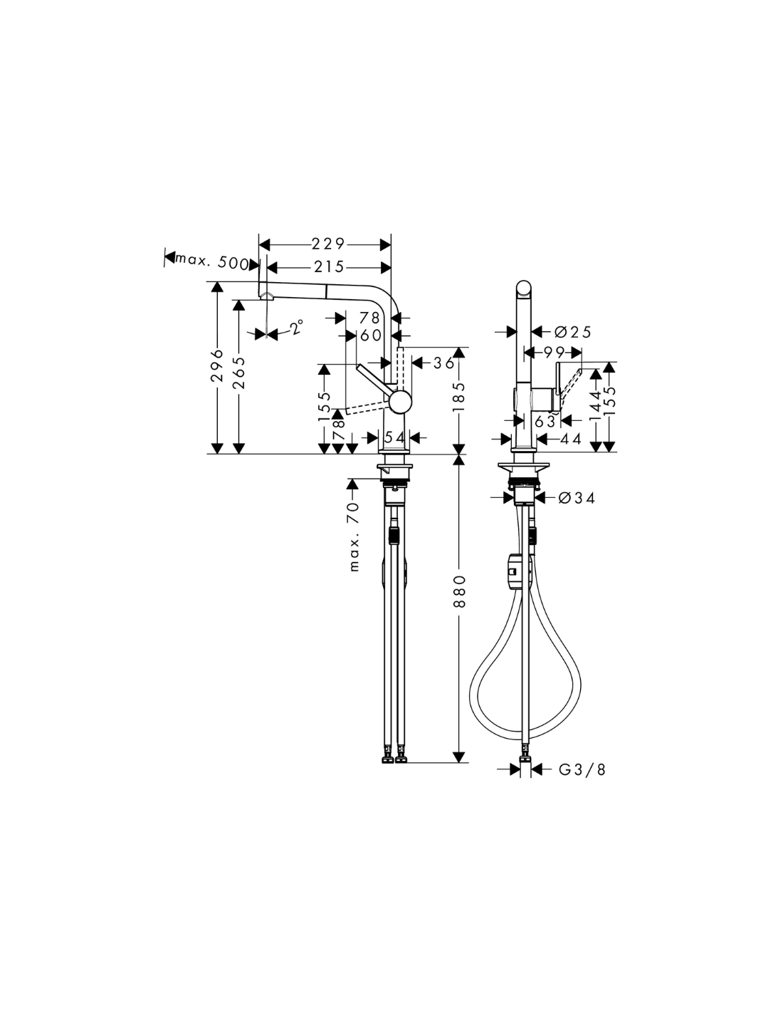 Medidas Talis M54 Mezclador monomando de cocina 270, caño extraíble, 1jet