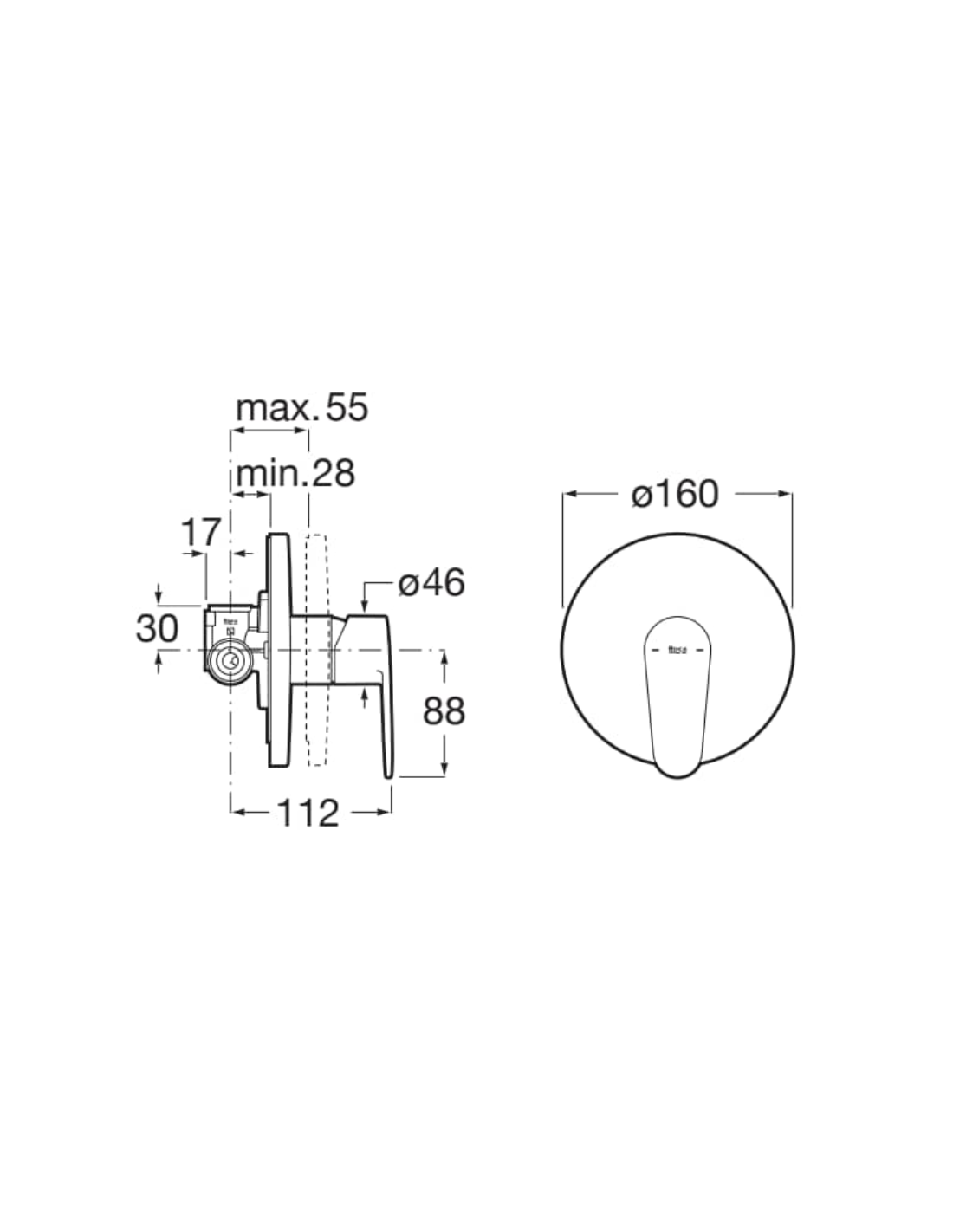 Monomando ducha empotrado Roca con una salida. Incluye cuerpo exterior y cuerpo empotrable.