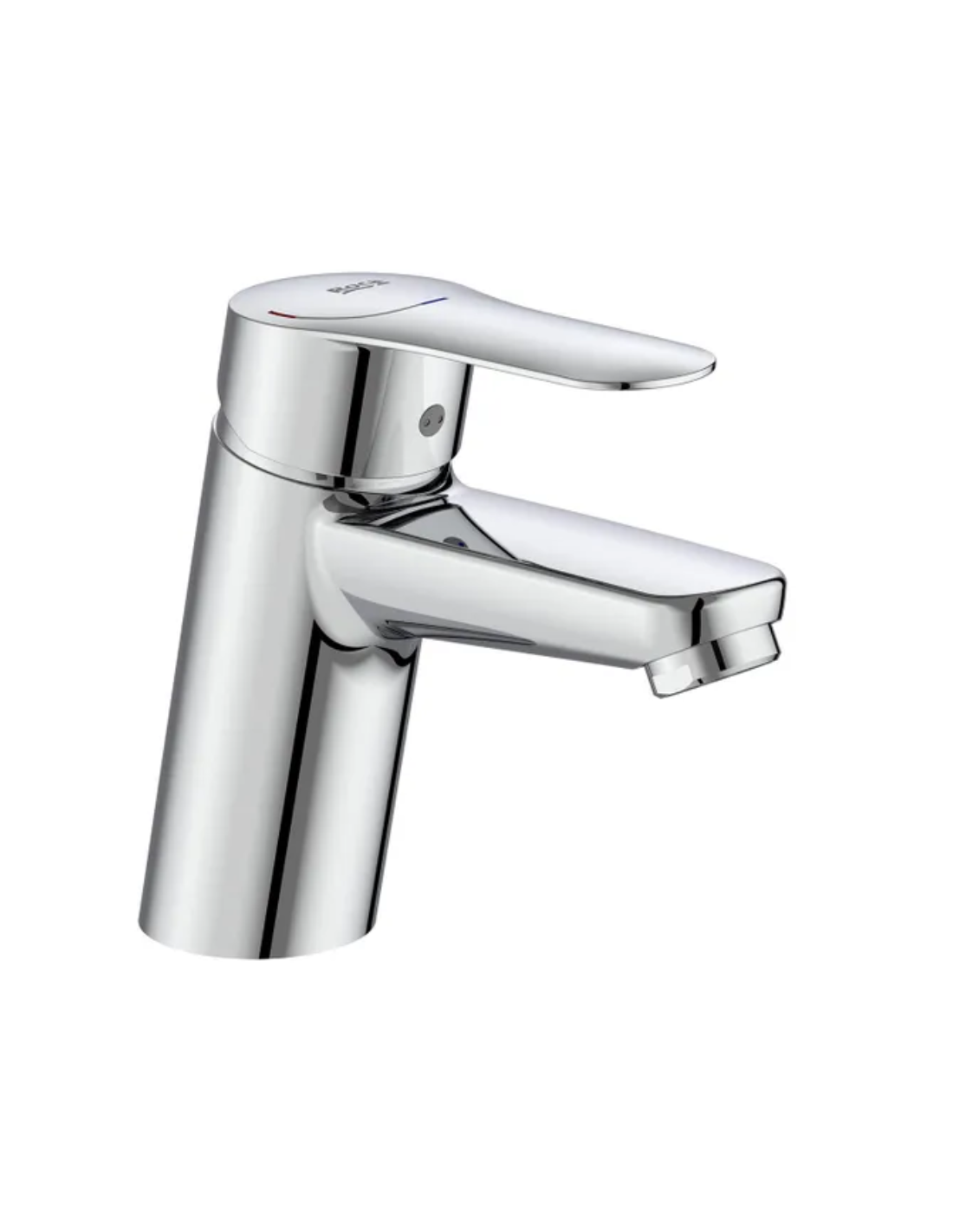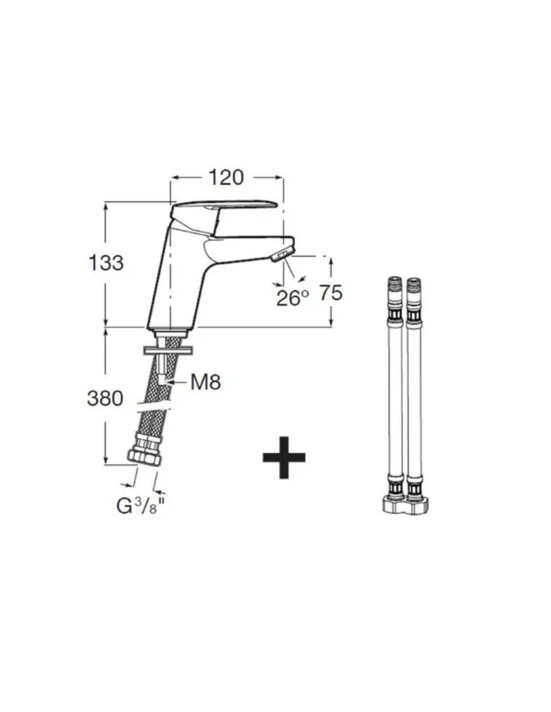 - Mezclador monomando para lavabo con cuerpo liso, aireador y enlaces de alimentación flexibles.