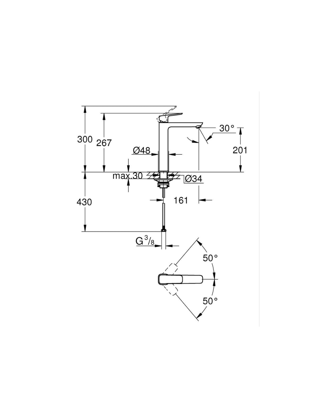 El grifo lavabo Ramon Soler Alexia XL, tiene una altura de 30 cm y una salida de agua de 19 cm
