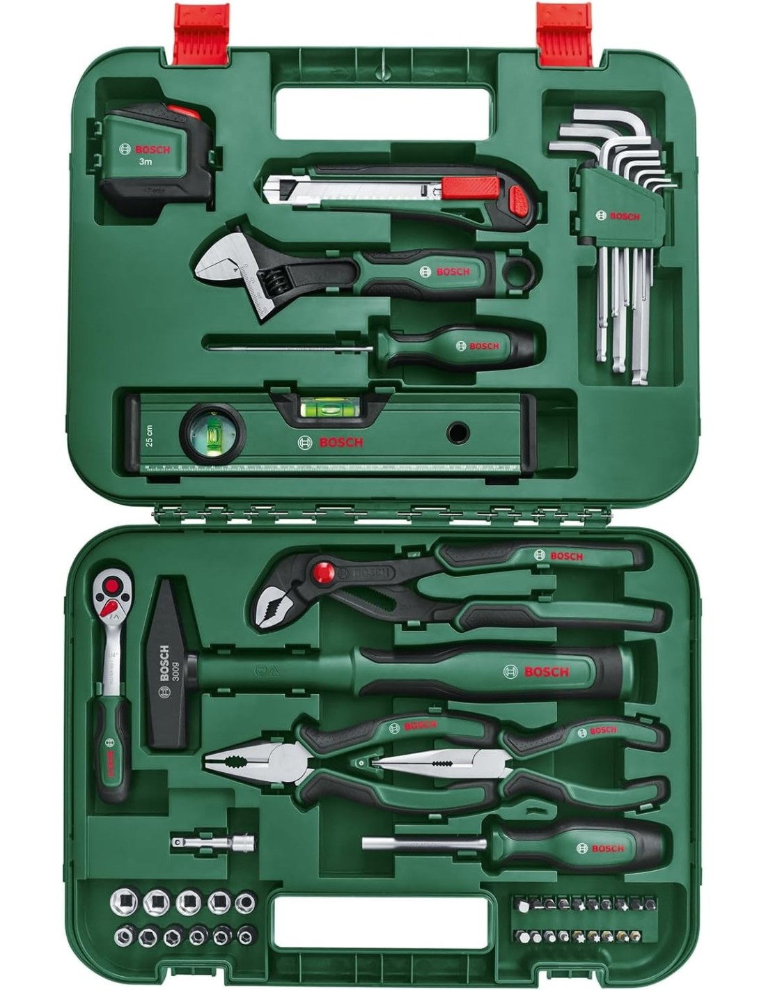 Juego completo de herramientas Bosch de 52 piezas, diseñado para trabajos de bricolaje doméstico, mantenimiento y pequeñas reparaciones. Incluye las herramientas básicas más utilizadas, organizadas en un maletín compacto y resistente para un transporte y almacenamiento cómodos.