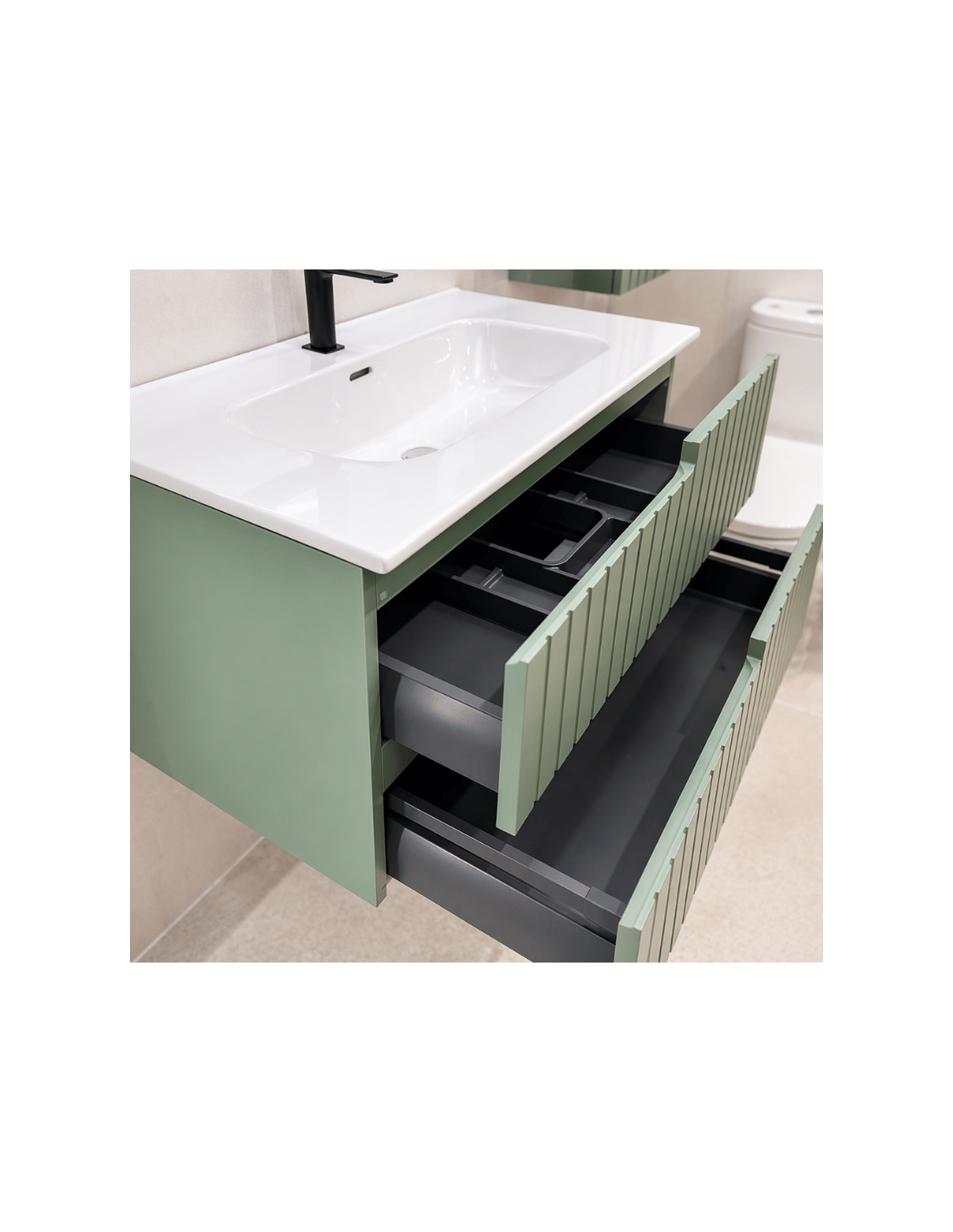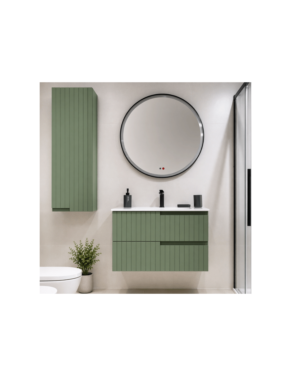 El mueble baño verde CLAIR está fabricado en tablero de 19 mm. La colección cuenta con una columna de baño verde a juego con el mueble.